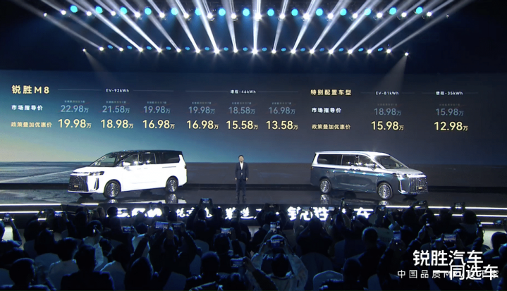 12月5日,锐胜M8正式上市,8款车型,指导价:15.98万元-22.98万元,政策叠加优惠价:12.98万元-19.98万元,同时首批车主交付。